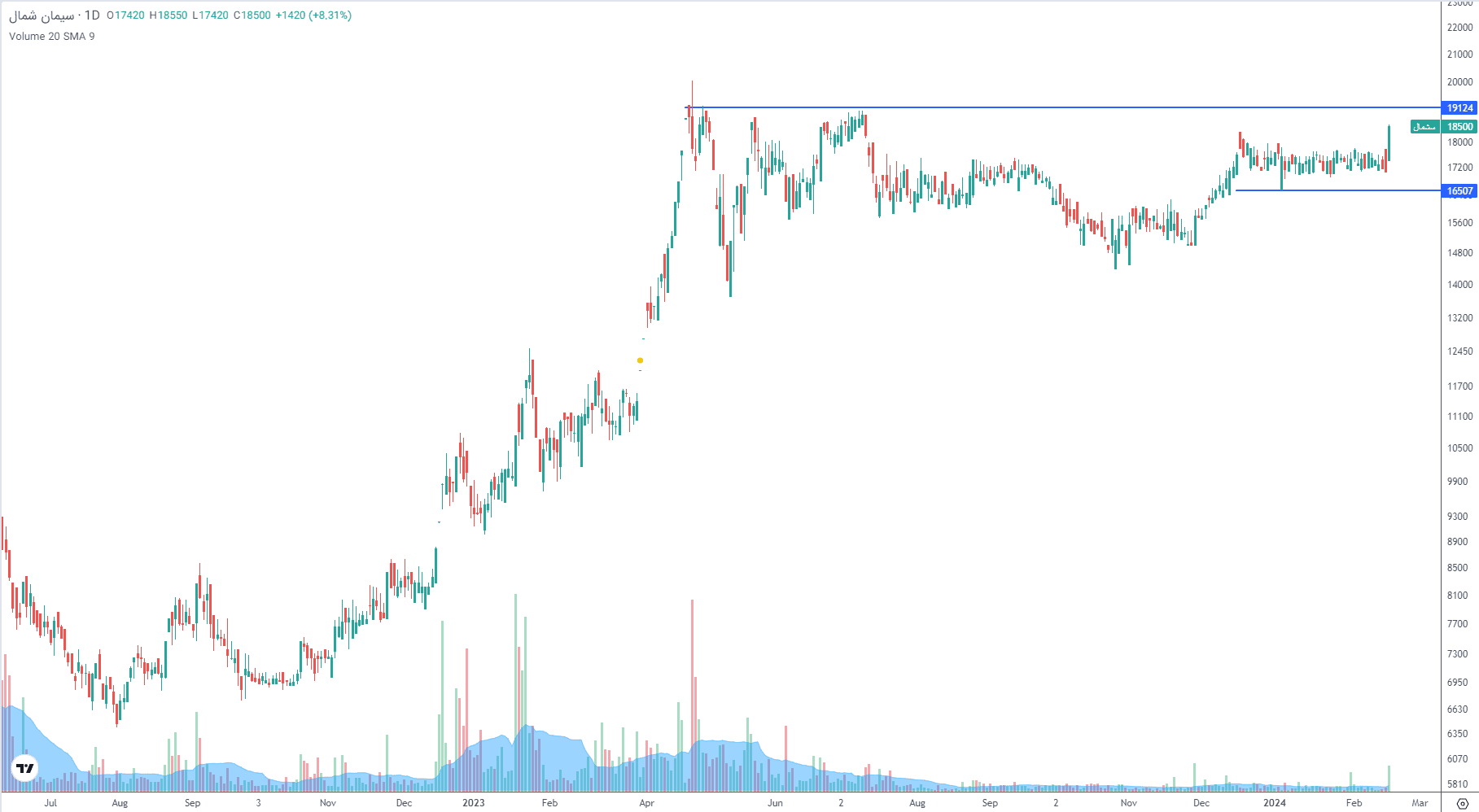 در معاملات امروز بازار، سمان شمال توانست با تقاضای مناسب و ثبت حجم مشکوک معاملاتی خود را به محدوده ۱۸۵۰ تومانی برساند. در حال حاضر مهمترین مقاومت این سهم تراز ۱۹۰۰ تومانی که در صورت شکست پرقدرت این تراز باید انتظار رشد مناسبی از این سهم داشته باشیم. در طرف مقابل نیز مهمترین محدوده حمایتی این سهم تراز ۱۶۵۰ تومان است.