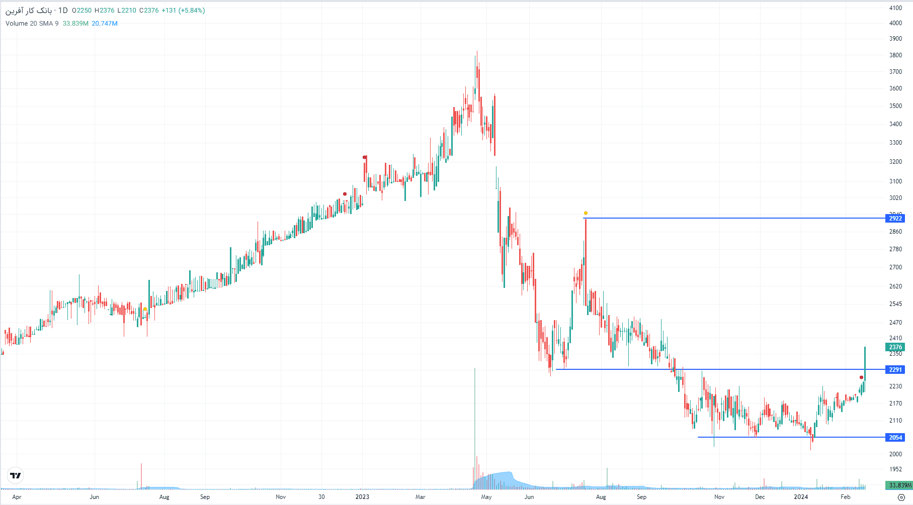 بانک کارآفرین درحالی امروز ورود پول هوشمند داشت که متاسفانه در بین سایر فاکتورها مانند حجم مشکوک معاملاتی اتفاق مهمی رخ نداد، بنابراین برای تحلیل بهتر این سهم باید منتظر شکلگیری سایر نشانههای برگشت باشیم. مهمترین محدوده مقاومتی این سهم تراز ۲۹۰ تومان و مهمترین حمایت این سهم تراز ۲۰۰ تومانی است.